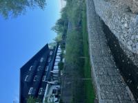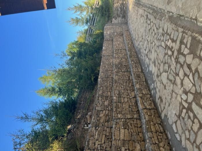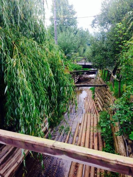 Gardul traditional, cu acoperis dranitit completeze peisajul, alaturi de aleile pavate cu lespezi din piatra de rau. Malurile paraului care strabate curtea si inconjoara locul de parcare, sunt aparate cu busteni de lemn, intr-o lucrare inginereasca pe care nu o veti mai intalni in alta parte. Rezultat al unui mestesug pierdut, lucrarea de "casite si podisti" a fost realizata de o echipa de proaspeti septuagenari din localitatea Malini, sub conducerea maistrului forestier "Tarzan".